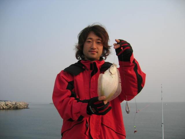 私も、支度を整え第1投、竿先がグングン!アタリが来ました。リールを巻くと少し重たい感じが、ダブルかな?、上がってきたのは28cmの良型マガレイ、『いるんでしょうー、そこそこのがー』。しかしそれから後は、あまりサイズは伸びず数だけ伸びて、リリースも含め40から50枚。