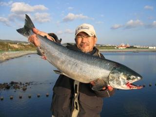 先程のウキルアーのポイントでは、サケがバンバン跳ね始め、またしてもウキルアー組にヒットの連続だ。ウキフカセ組の前は時折ハネは見える物の回遊が少ないのかなかなかウキが入らない。そんな中、地元の名人Sさんに大きなアタリがやっと来て、フカセ組の1本目がキャッチされた。ドラグをどんどん出したサケはビッグなメスのサケ。おみごと!