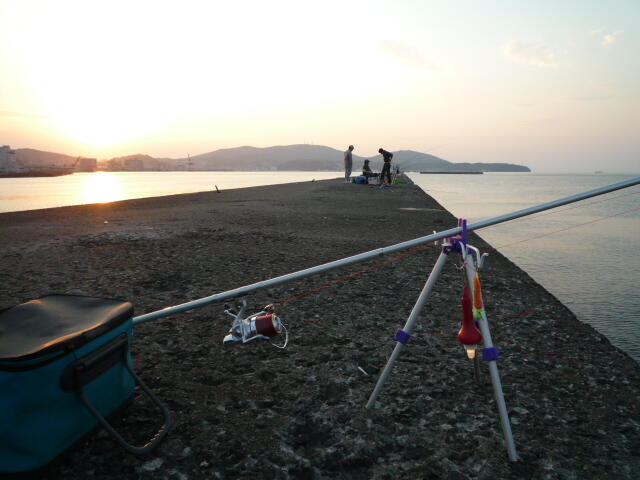 25日(木)。南防波堤基部、駐車場にに着いたのはPM6:15。20台前後の車が止まっており、さほど混雑はしていない様子。防波堤も中間部から先端はがら空き状態。まだ釣れ始めたばかりで、「釣り新聞」にも情報が載っていないためか予想以上に空いていた。