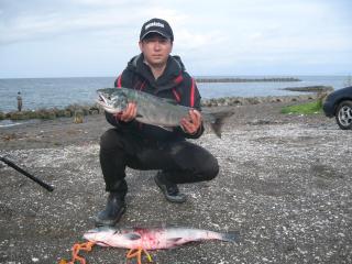 人も疎らとなった6時頃、離れた場所で突然さけのモジリ、跳ねを発見しすぐに移動。フカセで遠投するも距離が届かない。そこで自作のオリジナル浮に交換し60M程度の遠投を試みると、タイミング良く群れが浮下へ。浮が斜めにすっと傾いた瞬間「ヒット」今年初あたり初ヒット。久々のさけの感触を楽しみながらゲットした。すぐに投げ直しもう1本追加(♂♀各1本)。