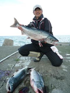数分のやり取りの後ネットに収まったサケは体高があり、80cmを超える大物!