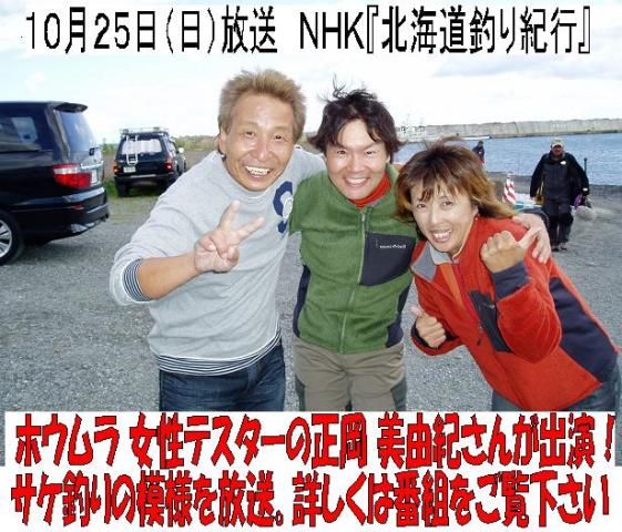 2009-10-13 (火) - 14:26 釣行メモ 魚種 サケ 釣行種別 サケ・カラフトマス 10月25日(日)AM8:00~8:25放送のNHK番組、『北海道釣り紀行』に当社女性テスターの正岡美由紀さんが出演します。 番組内容は、北見幌別川沖、船からのサケ釣りの模様を放送予定。 「釣り新聞ほっかいどう」菊地副編集長さんとキャスターの岩尾さんと共に、好釣果上げた模様。 詳しくは番組をご覧下さい。 ・ 釣り人 tanken