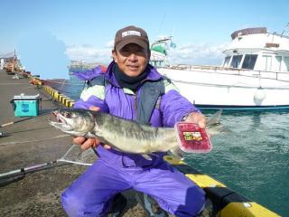 私は、海中の鮭の群が見える目を持つ釣り名人を知っています。 その人物は、ホウムラフィールドテスターの佐々木 優 氏です。 私は、サケ・カラフトマス釣りがめっぽう好きで、最近の2ヶ月はオホ-ツク海へと通っています。 紋別市に住む佐々木氏との釣行回数も多く、今シーズンも何度も同行させてもらいました。 ・ 今回の釣行も佐々木氏の地元、紋別港でのサケ釣りです。 初日の11/1は佐々木氏と釣友、そして私の3人。 ガリンコ号が停泊する白灯周辺からのスタートです。 サケのジャンプを目撃し1人中間部へ移動し見事にヒット! 200m程離れて釣りをしていた君は誰の助けも借りず、1人でタモ入れに成功し良型のメスザケをキャッチ!! それを見ていた佐々木氏と私はすぐに移動をし、君のもとへ。 左に君、真ん中に私、右に佐々木氏が並び、3人並んでウキフカセスタイルで釣りをスタート。 ・ すると佐々木氏が 『左からサケの群が来た』 私と君 『え!どこ?どこ?』 佐々木氏 『手前だ!早くしないと通り過ぎちゃうぞ!』 ・ 海面をよく見ると佐々木氏の言うとおり、私の前方20mに鮭の群が泳いでいる。 サケを散らさないように、群の奥へ仕掛けを投げ込みゆっくりと手前へ引き寄せるが、エサのカツオがサケのタナまで到達するのが遅く、サケは素通り!! あらかじめサケの通るコースへウキフカセ仕掛けを投げ入れていた佐々木氏は一発ヒットー!!!!! 海面の色の違いで群を見分けることが出来る佐々木氏は、どの釣り人よりも早く回遊コースに打ち込むことが出来る。 ・ ・ 私も言われると解るのだが、何しろ佐々木氏は見つけるのが早い。私達が見ると日の影なのか、群なのか解らないが、佐々木氏ははっきりと見分けがつくらしい。 背ビレを出さなくても、ジャンプをしなくても、群が見える目を持つ佐々木氏は、他の人よりも圧倒的に有利であり、その結果常に人より多くの釣果を上げている。 ・ ・ 佐々木氏の2匹目は・・・・・ 『サケの群が左側へ行ったよ~』 『さっきと同じコースの逆だから、仕掛けを手前に寄せろ~!!』 私達は、サケのコースに合わせ仕掛けを移動するが、またしてもゲットならず? 佐々木氏: 『なにやってるのさ~~。釣っちゃうぞ~~~。』 自分の仕掛けを回収し、私達の左へ投げ入れた佐々木氏はうまくサケのコースに投げ入れ、さらに誘いをかけ、2匹目を一発ゲット! 仕掛けのタナは3人とも同じ1.8m。タコベイトも同じ「ヤマシタ1.5号パニックベイト夜光ピンク」エサも同じく「薄造りにんにく塩〆カツオ」を2cm×3cmにカットした物と「カットにんにく赤イカ」のWにんにくタイプ。 なぜ?なぜ?なぜ・・・・・??? 佐々木氏いわく、『サケを見つけるだけじゃない。微妙なウキのアタリを見極めること!』との事。 ★★★★★★ ★★★★★★ サケは60cm~80cm以上もある大物で、釣れた後の引きは強烈だが、ウキフカセ釣りのアタリは非常に小さい。 サケ釣りのスタイルは大きく分けて3種類。 ルアーにカツオやサンマ、赤イカを付け、ゆっくりと引くウキルアー釣りと、 フロートを付けた投げ仕掛けに、カツオやサンマをエサにしたぶっこみ釣りと、 カツオやサンマを付けた仕掛けを漂わせるウキフカセ釣りの3種類。 ★★★ ウキルアー釣りはコツコツと前アタリがあった後、針に重みを感じたらアワセをするタイプ。、 ぶっこみ釣りは、10本前後の投げ竿で、ガッツリと喰い込んだアタリを取る豪快スタイル。 ウキフカセ釣りは、小さなアタリを素早く読みとるスタイル。 ★★★ 皆さん?、ウキフカセ釣りは、ウキが海中に入ってからアワセると思ってませんか? 実は、ウキフカセではウキが海中に沈み込むケースは滅多にないのが実状で、サケのアタリは非常に小さいのですよ。 ゆっくりと回遊しているサケが、エサのカツオに興味を示すのですが、口先でついばむ程度の軽いタッチです。2,3度ついばんだら離してしまいます。 ・ ついばんだときに海面の 『ウキは2cm程沈むかな?』 『ウキは横に少しずれるかな?』 『ウキは少し斜めに傾くかな?』 ・ 『ウキは2cm程沈むかな?』は、サケは一定のタナを泳ぎながらエサをついばみ2,3度で離すためウキのアタリは「ポンポン」と軽く沈むだけ。他の魚と違い、空腹でエサに食いつくわけではないため、喰ってから下に逃げ込むような行動は滅多に取りません。 針の違和感や、引っ張りのテンションなどがあって初めて横に走ったり、下に潜ったりするのではないかと思います。 ですから豪快にウキが入ることは滅多にないのです。 ・ 『ウキは少し横にずれるかな?』は、ゆっくりと一定のタナを泳ぐサケが、エサをついばみ、くわえたまま、数十㎝~1m位泳いだときにウキが横にずれるアタリがあります。目印のない広い海で沈みもせず横にずれるだけのアタリは、う~ん微妙です。 ・ 『ウキは少し斜めに傾くかな?』は、エサをくわえ、違和感があったサケが一瞬でエサを吐き出し逃げ去ったような時のアタリではないでしょうか。 ・ ウキフカセ釣りのア