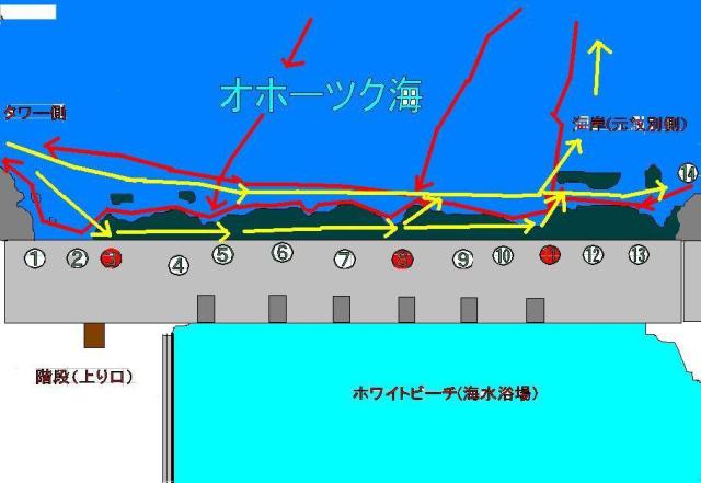 ⑫:⑬:ブロックやテトラとの境目で釣る事も注意が必要。