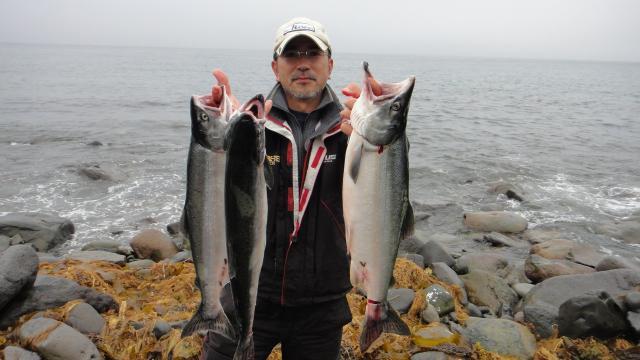 8月13日から、三日間の計画で羅臼でカラフトマス狙い。 4人で来ていますが、初日から全員ゲット。 ************************ ************************ 13日。AM5時に水野氏宅へ向かいに行き、5時30分小樽を出発。 高速に乗り、数か所の観光地を巡りながら、斜里町宇登呂側から知床峠を抜け羅臼へ到着。 もう一組の同行者は20分ほど早く羅臼へ着いていたので釣行予定の川で合流。 道路脇の小さな川だが、以前も好釣果を得たためこの川で勝負。 ************************ 河口すぐそばに駐車し、運転席から河口を覗くと、・・・・・群れだ!!!!!~~~~ 靴だけを長靴に履き替え、竿と餌だけを持ち速攻キャスト。 ************************ 新商品の『遠投自立ウキ6号』を装着し、ウキ下50㎝とした仕掛けには、 エサは『エビちゃんシリーズ:にんにく赤えび』。 ************************** ************************** ************************** 車から降り、開始5分で 銀ピカの雌をゲット。 群れはすぐに散ってしまい、厳しいかと感じたが、数十分後再び群れが訪れ、私と水野氏にダブルヒット。 初日から4人全員がゲットでき、今後の数日間に大きい期待ができる。 初日の釣果は 水野さんが2匹 私が2匹 初日から♡♡♡ **************************** **************************** カラフトマスは真水が流れ込んでいると、どこでもチャンスがあるため、こんな小さな川でも釣行は可能だ。 天狗岩周辺や、ルサ川、知円別漁港はもちろんのこと、流れ込みであればどこでも可能だ。 ******************************* ******************************* 今年は、カラフトマスの豊漁年との噂が飛び交っているため、明日も期待を込め同川で釣行することとし、・・・・・途中の斜里町道の駅にあるお肉やさんで調達したジンギスカンと味付き鹿肉で夜の宴会へ??? ******************************* ******************************* 2日目。 AM2:50に目覚ましをかけ、3:00から河口両サイドで夜明けを待ち、1時間後の4時ぐらいから釣行開始。 夜明け30分は河口周辺を狙うが釣果なし。 その後沖目で群れを発見し全員で沖目めがけキャストを開始。 最初のヒットは・・・・私だ~~~!! その後は、水野氏もヒットの連続で 全員が6~12匹の結果。 この日は30分から1時間おきに群れが回遊し、休憩する暇がないほどだ。 エサを付けた竿を釣り場に置きっぱなしにし、車の運転席から海を見つめ群れが見えると飛び出していきキャスト。 一度、すべてをしまい、羅臼町コンビニへと買い物へ行き、戻ってみると昼ご飯を食べる暇がなく、河口には群れが・・・・・ 『エビちゃん』を付けすぐにキャスト すぐにヒット。 この日も釣果は好調で、 1人、6~12匹の好釣だ。 夕方までの釣りを終え、この日は知人の漁師さんから頂いた《活ホタテ》で刺身を作り、宴会開始。 ・・・・・・・・・・・ ******************************* ******************************* 3日目 最終日。 この日も、2:50に目覚ましを掛け、3時から河口で待機。 1時間後の薄明るくなったのを待ってキャストを開始。 初日、2日目と連続釣果の水野氏は余裕を持ってゆっくりと準備。 その間、私は、目の前2mのところでモジリを発見し、すかさずウキをポイントに合わせ、ゲット。 最終日だからこそ、釣らなければならない。 慌てて2人も参戦し、ヒットヒット・・バラシバラシ この日は食いが浅く全員がバラシの連続に合い、苦戦するが、1時間もしない内に全員がゲット成功。 ****************** 初日2日目は、河口右側に群が集まる傾向が続いたが、3日目は左側に集中。 手前にはなかなか寄らず、沖側でのヒット率が高く遠投を要したが、何とかゲット。 日が高く昇った10時過ぎには、大漁の群が河口に押し寄せ、キャンピングカーで訪れていた家族連れにもにも、銀ピカがヒット。 ***************** ***************** 20年以上前から幾度となく訪れている知床だが、今年は数年ぶりの好釣果を得た。 今年はやはり、豊漁年なのか? チャンスはまだまだ続き、今後はサケも混ざり、12月まで釣れるサーモンフィッシング。 皆さんも、『遠投自立ウキ』と『エビちゃん』で好釣果を