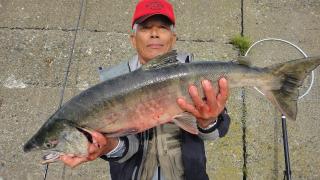 足下で暴れるサケは必死に抵抗し、針から外れ、故郷の川へと急いで帰っていきました・・・とさ?