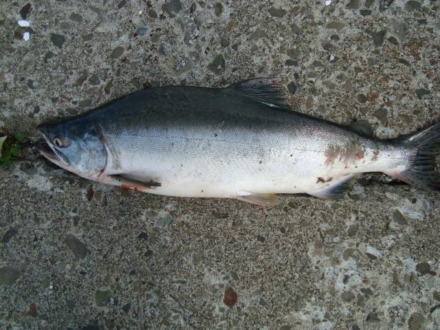 慌てて、投入数回。ヒットです、タモを置いてあるところまで40~50m…オスのカラフトマス結構ひきが良く