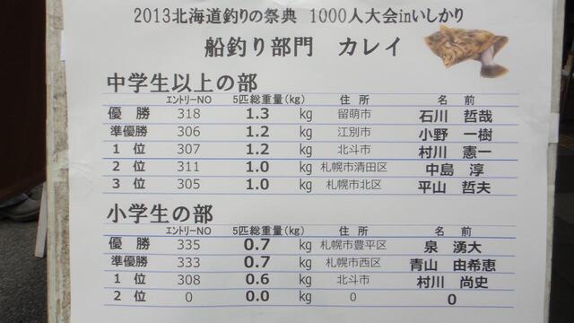 2013-05-20 (月) - 10:37 釣行メモ 釣行日 2013-05-19 場所 石狩~小樽周辺 5月19日(土)、 日本釣振興会北海道地区支部、石狩観光協会 主催の、 2013 北海道釣りの祭典『1000人大会inいしかり』が行われました。 総合優勝の 木浪 重貴さん (小樽市) アブラコ 43.3cm おめでとうございます。 投げ釣り部門 カレイ 個人の部 入賞者の皆さん おめでとうございます。 投げ釣り部門 アブラコ 個人の部 入賞者の皆さん おめでとうございます。 投げ釣り部門 その他(カジカ・ホッケ・ソイ) 個人の部 入賞者の皆さん おめでとうございます。 船釣り部門 カレイ 中学生以上の部 入賞者の皆さん おめでとうございます。 投げ釣り部門 カレイ ファミリーの部 入賞者の皆さん おめでとうございます。 投げ釣り部門 アブラコ ファミリーの部 入賞者の皆さん おめでとうございます。 船釣り部門 カレイ 小学生の部 入賞者の皆さん おめでとうございます。 釣り人 tanken