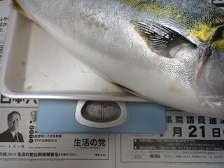 2013-07-14 (日) - 18:00 釣行メモ 釣行日 2013-07-14 場所 積丹岬:無線塔沖 水深50m~65m 釣友達とボート釣りでブリ狙い 3連休は連日のボートフィッシング 1日目13日(土)は2艘で、千葉氏、森永氏、私。 2日目14日(日)は、水野氏、私 3日目15日(月)は、森永氏、水野氏 初日は千葉氏が早朝からボートを出し、好釣果を上げていた中、私と森永氏は5時になってもまだ出ていない・・それも、家からまだ出ていない。 結局、現地からボートを出したのは「8時!だよ」 2馬力エンジンでポイントに着いた時には、「時すでに遅し」 私は午後まで粘ったか釣果なし。 風が出てきたため、帰りがけに一流しすると、森永氏にヒット~(写真撮り忘れ) 続きは後で・・ 13日(土)は、千葉氏が早朝からスタートダッシュし、まずは一人で積丹岬:無線塔沖のポイントで3本ヒットさせゲットに成功。 4本目の大物にラインを切られた後、獲物は十分に釣り上げたため早上がりで車で待っている家族のもとへ・・途中、遠くで私たち二人が乗ったボートとすれ違ったようだが連絡が取れずじまい。 千葉氏はその後、私たちが必死で竿を振り続けていた中、子供たちを乗せ家族サービス中。 私たちは、風が出てきていたが粘って竿を振り、森永君が最後の最後にい匹をゲットで、13日(土)の釣行は終了。 翌日の14日(日)は、水野氏を乗せて、前日のポイント:無線塔沖へ向かった。 遊漁船や、マイボートが多数入り乱れた中、他船で数匹のブリゲットを目撃。 水野氏と私は真剣に竿を振り続けていた中、『ガツン!!』とヒット。 ・・・・・私に。 水深50mラインの底付近でヒットし、最初は抵抗なく上がってきていたが、途中から竿が海面に刺さり込み、ドラグを引き出し抵抗を開始。 ボートの向きを変えるほどの強い引きで、十分に楽しませてもらったが、その後しっかりとネットにインしてもらいました。 帰宅後、サイズを測ると85cm:8kg弱(血抜き後) 今季初のブリは、定番のお刺身で堪能。 やっぱり美味! 15日(月)の海の日は私はボートを出しませんでしたが、 釣友の森永君が水野氏と出廷。 15日の模様は森永君のブログでご確認を。 釣り人 yuusaku