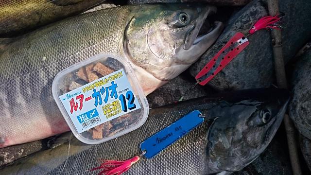 2017-09-28 (木) - 08:53 釣行メモ 釣行日 2017-09-27 使用ホウムラ製品 DO・SA・N・KO 北海 爆ルアー 日本海のサケ釣りが本格的になり、急上昇中! ★ルアー ホウムラ【北海爆ルアー:ミラーブルー45g】 ★エサ ホウムラ【ルアーカツオ 12:塩〆】 ★ロッド ホウムラ【H-EARNEST:1103MH】 一か所目で釣った、良型のメス 2か所目で釣った、良型のオス ★ルアー ホウムラ【北海爆ルアー:ミラーブルー45g】 ★ルアー ホウムラ【北海爆ルアー:レッド黒点45g】 ★エサ ホウムラ【ルアーカツオ 12:塩〆】 ★ロッド ホウムラ【H-EARNEST:1103MH】 早朝5時から竿を出し、 1カ所目で1本、2カ所目で3本。 合計4本の釣果 釣り人 yuusaku