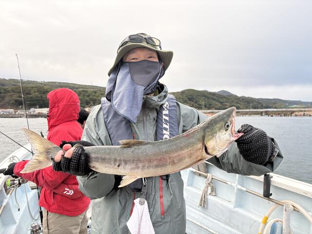 ◆10/12(日):古平川河口沖合に船を止め7名全員(内女性3名)でウキルアーでサケ狙い