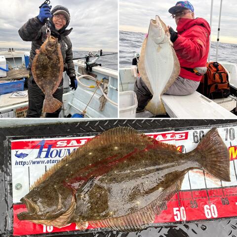 2025-11-25 (火) - 17:52 釣行メモ 釣行日 2025-11-23 釣行種別 遊漁船 Peace ホウムラ游漁船【Peace】11月23日(日):良く釣れたヒラメ釣り11発24日(祝):あまり釣れなかったタラ釣り★古平から小樽に船を移動して一発目はヒラメ釣り11/23(日):6名様を乗せ出港、目指すは水深50m風と前日から残るウネリがぶつかり合う中、船をゆっくりと走らせ、1時間15分かけポイント着船上は釣りづらい状況ですが、釣果は出だしから好釣!ジギング1名好釣、バケ釣り4名絶好釣、バケ釣り1名絶不調流すごとに10~12枚釣れ、竿頭11枚が2人、9枚、8枚、6枚、0枚 いつもの常連さんが0枚??絶不調実釣3時間で45枚は、まずまず。バケごとぶち切られた大物も2匹50㎝以下はリリースして8枚持ち帰り(内1枚が船長へのプレゼント!)★11/24(祝):インフルキャンセルが出て5名様で出港長旅となる沖五目へ! 1時間45分かけポイント着一週間前にタラが好釣のポイントスタートタラ不釣??ヤナギとホッケ、宗八などが釣れてます釣れるタラは、ポンタラ、中タラばかり絶好調でもなく絶不調でもなく中間の釣りタラは9本ぐらい。**** 今後も、小樽運河からの出港となります。 平日も募集中11月29日(土):タラ&沖五目 11,000円 定員6名:満席11月30日(日):ヒラメ釣り 10,000円 定員6名:空き3名 12月も募集中 予約電話 080-8626-6613*********全魚種、ロッドセットのレンタルや、仕掛け、バケ、エサを含めた『手ぶらプラン』も可能です*********空き状況は下記でご確認いただけますhttps://www.otaru-houmura.com/peacehttps://www.otaru-houmura.com/anglersloghttps://www.otaru-houmura.com/