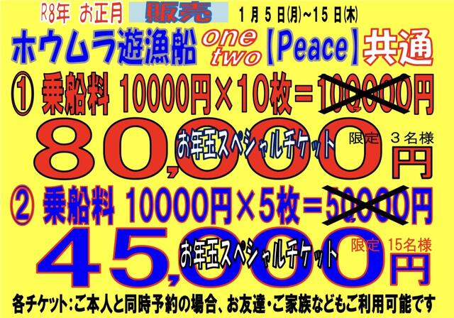 2025-12-17 (水) - 11:05 釣行メモ 釣行日 2025-12-16 釣行種別 遊漁船 Peace ① ホウムラ遊漁船 ワンピース one【Peace】 ツーピース two【Peace】『共通のスペシャルチケット』の予約を開始いたします』https://www.otaru-houmura.com/blog/1765868443 ::::::::::::::②ホウムラ店頭販売:お年玉【スペシャルセール】のご案内https://www.otaru-houmura.com/blog/1765868558 ::::::::::::::③ホウムラWebオンラインショップ【スペシャルセール】のご案内https://www.otaru-houmura.com/blog/1765868631 :::::::::::::: 詳細は各ページでご確認願います。 どうぞよろしくお願いいたします。